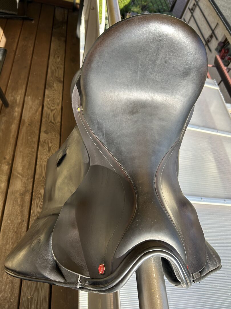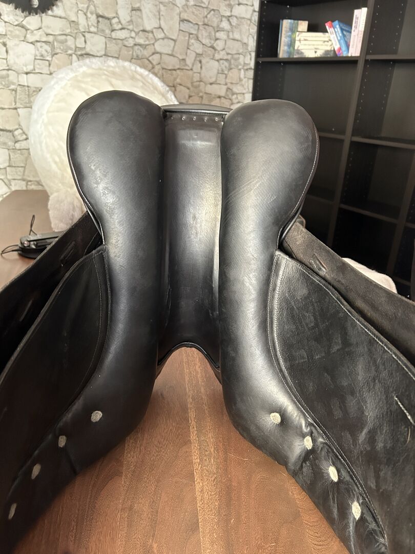 Albion SLK dressage saddle - I sell here a very well maintained and top maintained Albion Europe SLK in 17.5 inches. The saddle has the HH (high head) gullet for horses with a lot of withers, it is also super for horses with high withers and straight back suitable by its HH chamber and its high padding on the panels behind. The saddle is from late 2013 and second hand has always been super cared for and can be warm modified by the saddler. At the saddle straps holes are a bit worn out but that does not bother and you still normal straps. The saddle has 3 girth straps and then so also be girt in the middle and back that not so much pressure on the trapezius muscle comes. The saddle was completely reupholstered in early March and new felt inserts purely made that no nodules or other things are on the saddle just for horses that are very very sensitive in the back. The saddle has the extra deep seat which puts one very close to the horse's back.