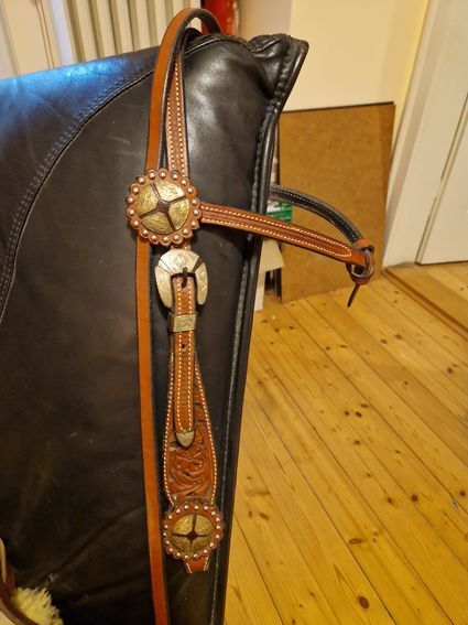 Beautiful western snaffle with conchos - Very nice western snaffle with embossed floral pattern in the leather. Good, sturdy leather in a warm brown tone. All buckles are in good condition.