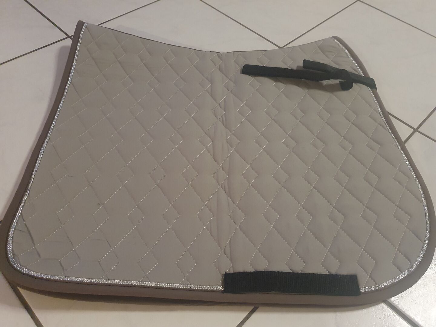 I'm clearing out and want to make some space. I am therefore offering a set in various shades of brown from different manufacturers. The following parts are included: - Eskadron fly hood WB dark brown - Two pairs of neoprene gaiters from Protect Horse Friends. One pair size M each for front and back. Little used and without defects, not completely clean in the wash. I have written on the labels which gaiter belongs on which leg, as this made it easier for the horse's owner. - Set of 4 warmblood bandages in chocolate brown from Cheval de Luxe. Look like new, I'm not sure if I've even used them. However, the nupsi of the zipper on the bandage pocket has broken off. - unused but stored in the stable gray/beige saddle pad from Equest in nice firm quality with silver piping. One quilting seam has unfortunately come undone.