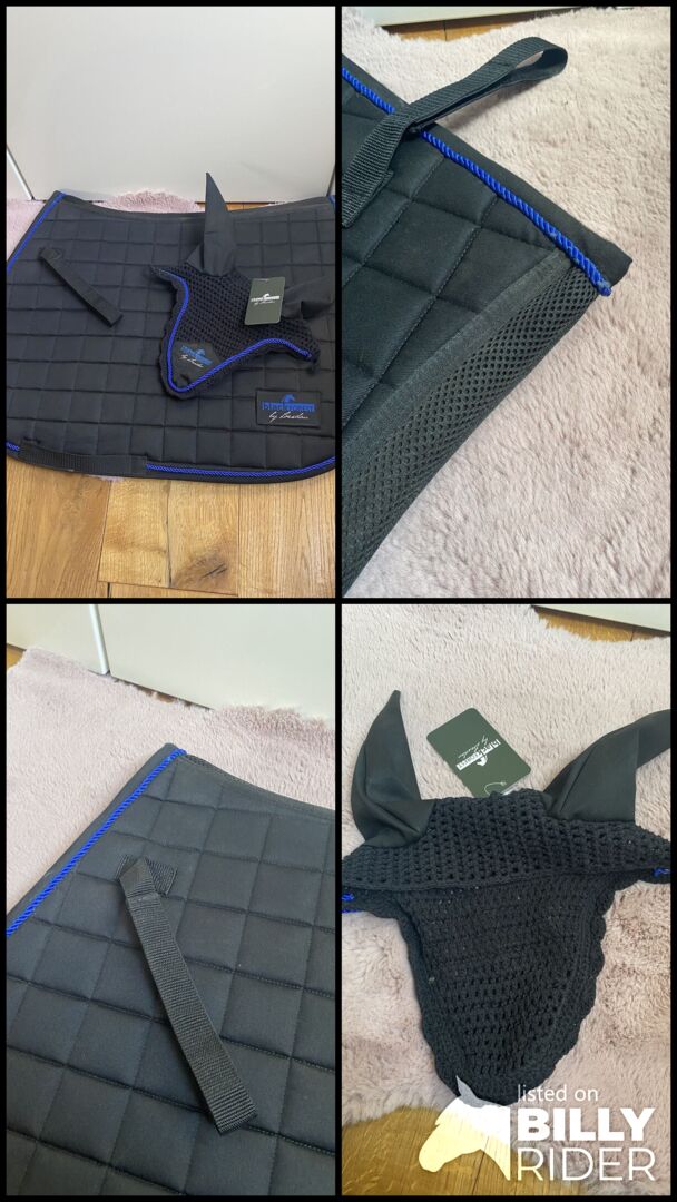 Blackforest saddle pad VS/jumping black blue Loesdau - I sell here a VS saddle pad in black with matching fly hood (unused, new with label!!) The saddle pad was used with pleasure, but is in very good condition and is sold washed.