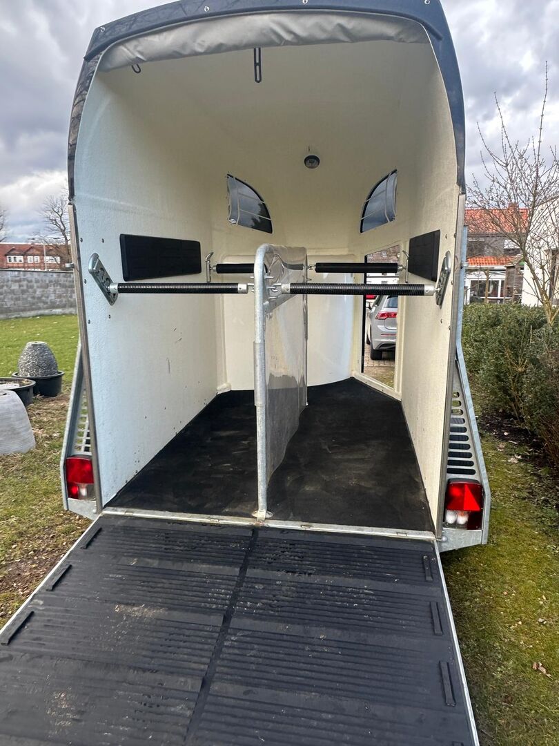 Böckmann 2 horse trailer - EZ: 01/2019 Chassis: CFF-Plus chassis incl. Wheel shock absorber, lockable ball coupling, mechanical overrun brake, 14" aluminum rim tyres, longitudinal beam chassis with V-drawbar (bolted), V2A bolting, automatic support wheel system Body: glued and sealed rubber floor, lighting system with reversing light and 13-pin plug, original Böckmann all-aluminum floor, hood: anthracite metallic, single wheel mudguards, plastic (black), body: anthracite metallic, rubber coating on rear flap (integrated step strips and side stop), decors, standard rear flap (without hinged door function), tarpaulin lift with integrated net, 2 side struts, 4 rear flap hinges, lifting device gas pressure shock absorber, closed rear strut, license plate holder with 2 steps, manoeuvring handle, with access door Interior: plastic scoop with handle, door net, broom with telescopic handle, additional box bar upholstery