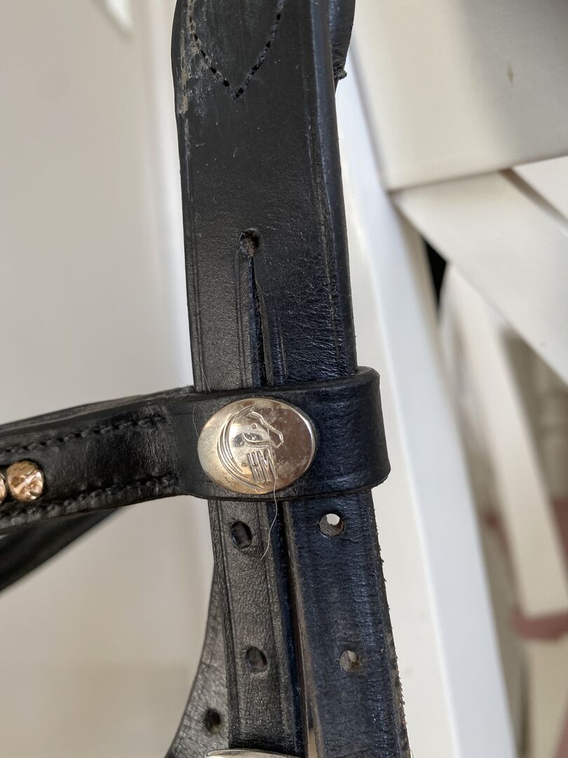 Bridle with rhinestones - English-combined noseband. Browband is studded with rose colored rhinestones. It has signs of use but is in good condition-no defects and all stones are complete. It does not come with a curb strap or reins. For this a sweetiron bit (double broken, D-ring, 12.5cm) shipping bears buyer