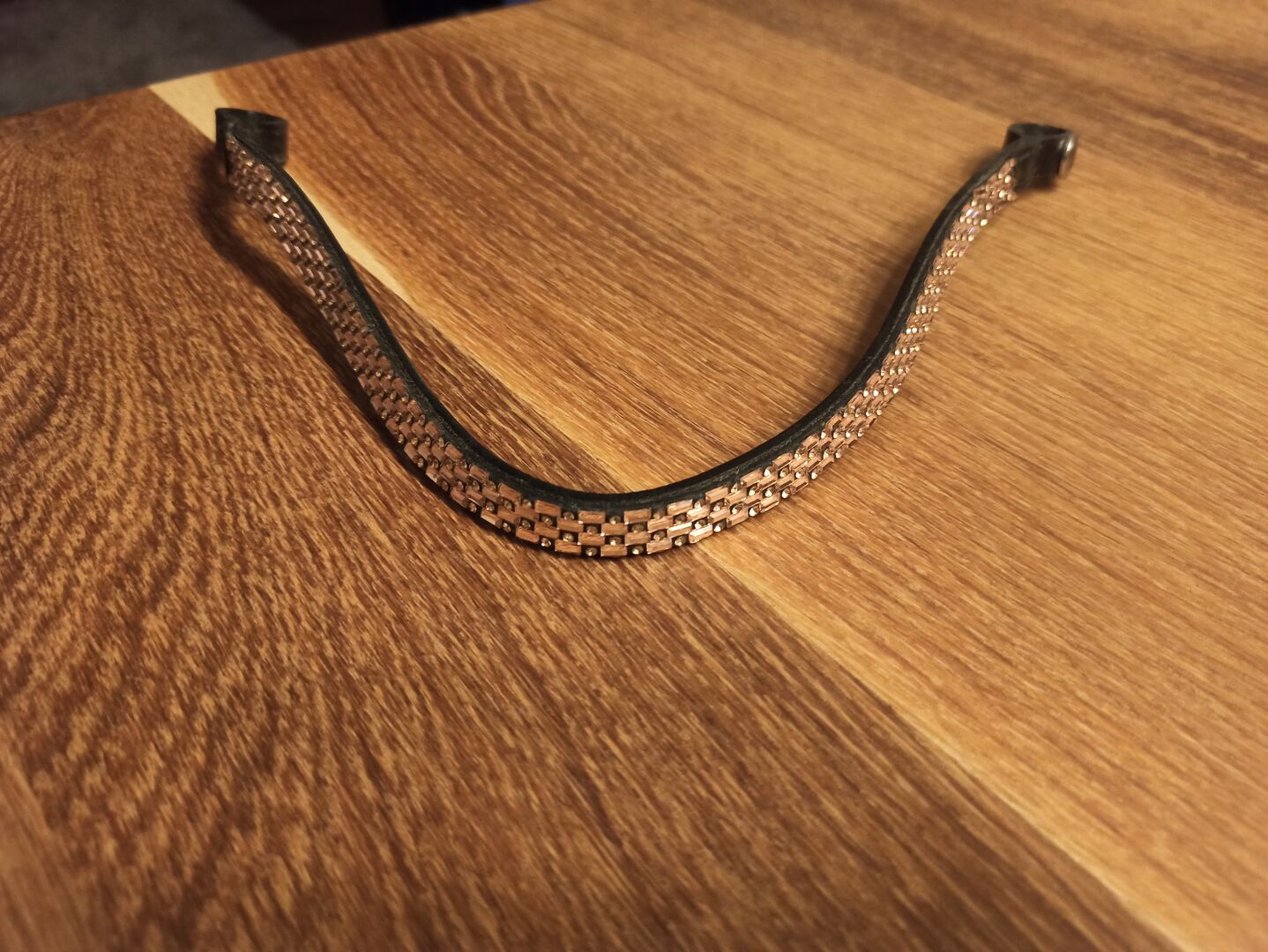 Browband rose gold - A pretty black browband with rectangular and round stones in rose gold. Used it for about half a year, but my horse has an elephant head, so I'm selling it. A normal warmblood he fits great.