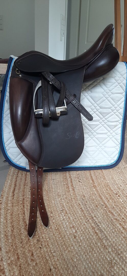 Data: -First hand model VIGO -Rarely used -Brown -shoulder cut back for the horse -Seabis also has the gullet plate change system -17 " seat -decent signs of use -With stirrup leathers, stirrups -With original saddle flap