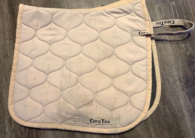 CeraTex Saddle Pad WB Dressage - CeraTex saddle pad, therapeutic textile with ceramic fibers dressage for warmblood in beige. CeraTex has a comparable effect to Back on Track. The soft and easy-care CeraTex ceramic fleece transports sweat very quickly to the outside. The entire materials are tuned so that they do not get soaked and stay wet. Therefore, these saddle pads dry quite quickly even in winter. The top side is dirt and water repellent due to very easy to clean. The underside is also easy to clean: damp cloth or sponge and most of the hair is already out. Due to the effect of the CeraTex material, the tension of the muscles is positively influenced, which can lead to more looseness and momentum. Only signs of use are discoloration from the saddle, otherwise tip top in order. NP 79 € Exchange / warranty not possible, because private sale Shipping possible, 4.99 € as a package