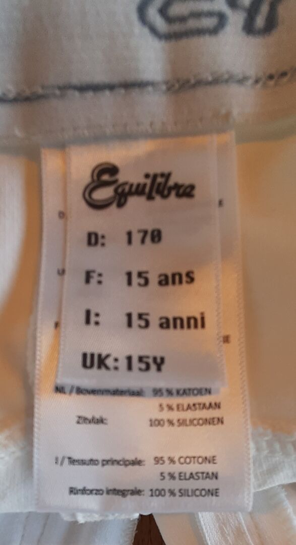Children's show breeches Equilibre size 170 full seat grip - Children's competition breeches Size: 170 Brand: Equilibre Color: white Grip (full seat) original price: 54,90€ For sale for 30€ The breeches are in good condition. They have rarely been worn. No holes! Only three pin-sized stains (see picture) Shipping is possible against payment of the shipping costs. PayPal among friends is also possible. This is a private sale. Therefore no warranty and no return.