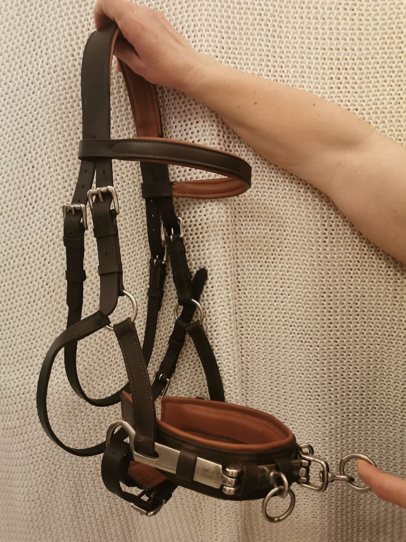 Cross fence made of leather with metal reinforcement - I sell here my cross fence. It is in the size thoroughbred. - made of durable, brown leather - with stable fittings > 3 rails to hang in. - softly padded at neck, browband and noseband - several times adjustable It has been cleaned and greased.