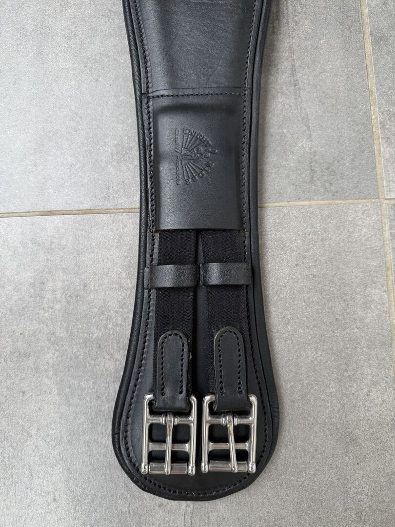 Dressage girth - Black leather girth with elastic bands and stainless steel buckles. received as a gift, but never used because I don't like elastic in the girth. Black leather girth, with elastic bands and stainless steel buckles. Received as a gift, but never used because I don't like elastic bands. The girth is 85 cm long.