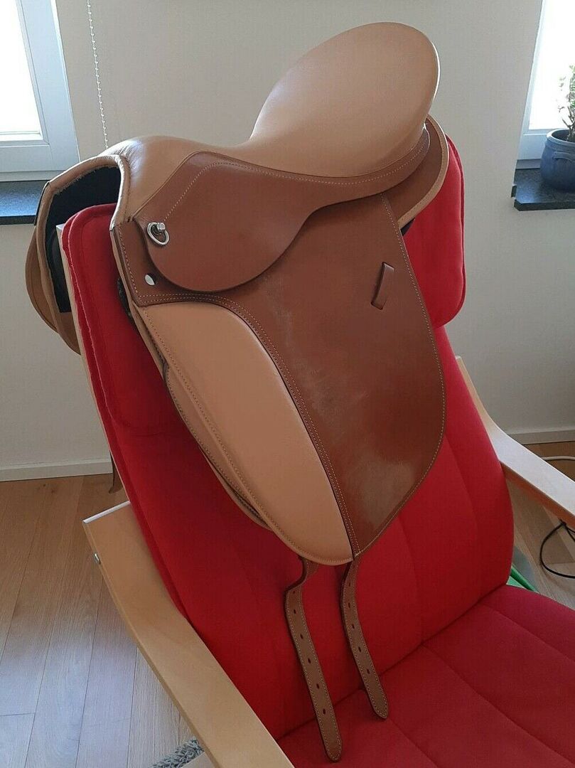 Dressage leather tree saddle similar Hidalgo - As good as new saddle, practical are the individually replaceable Velcro pads. These are here 43 cm long, but can be easily exchanged. Due to the flexible leather tree, the saddle can adapt to almost any horse's back. The saddle has slight signs of use by the stirrup leathers, otherwise in great condition.