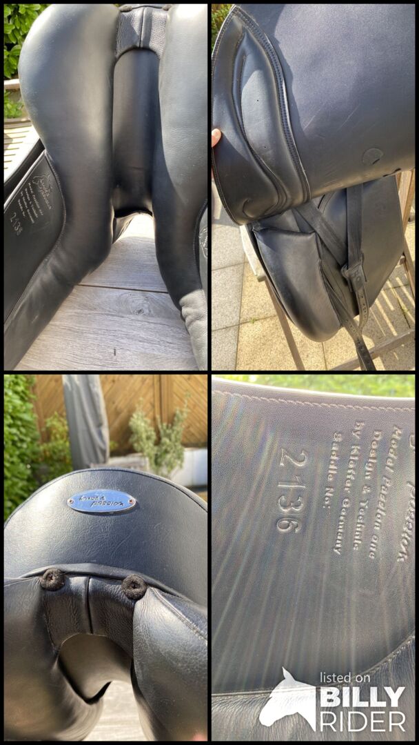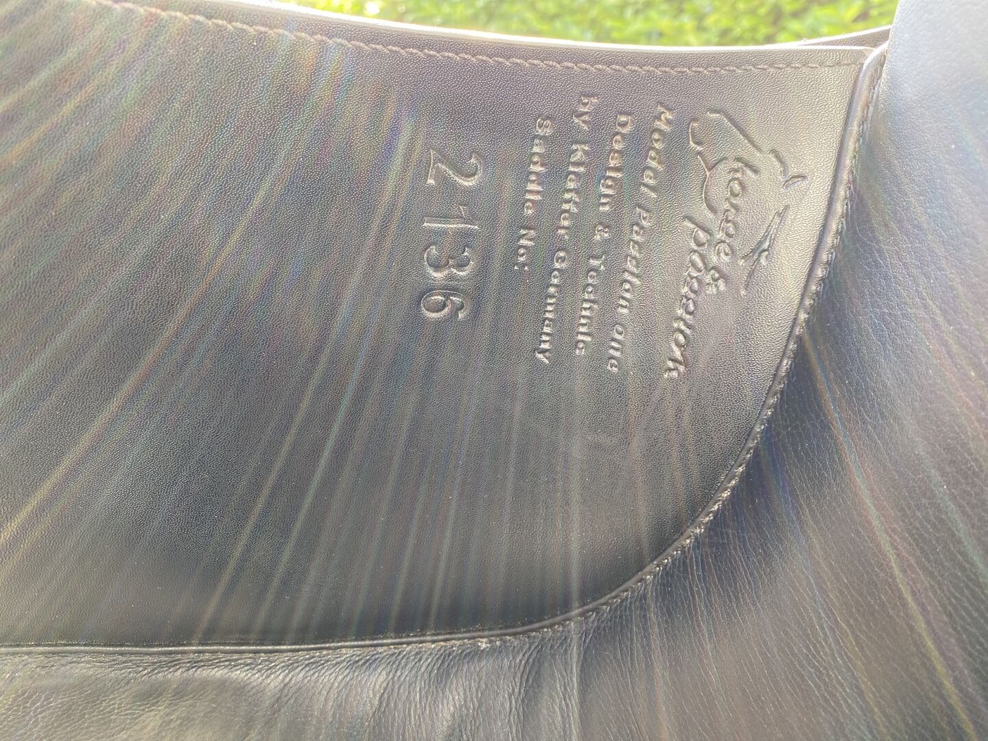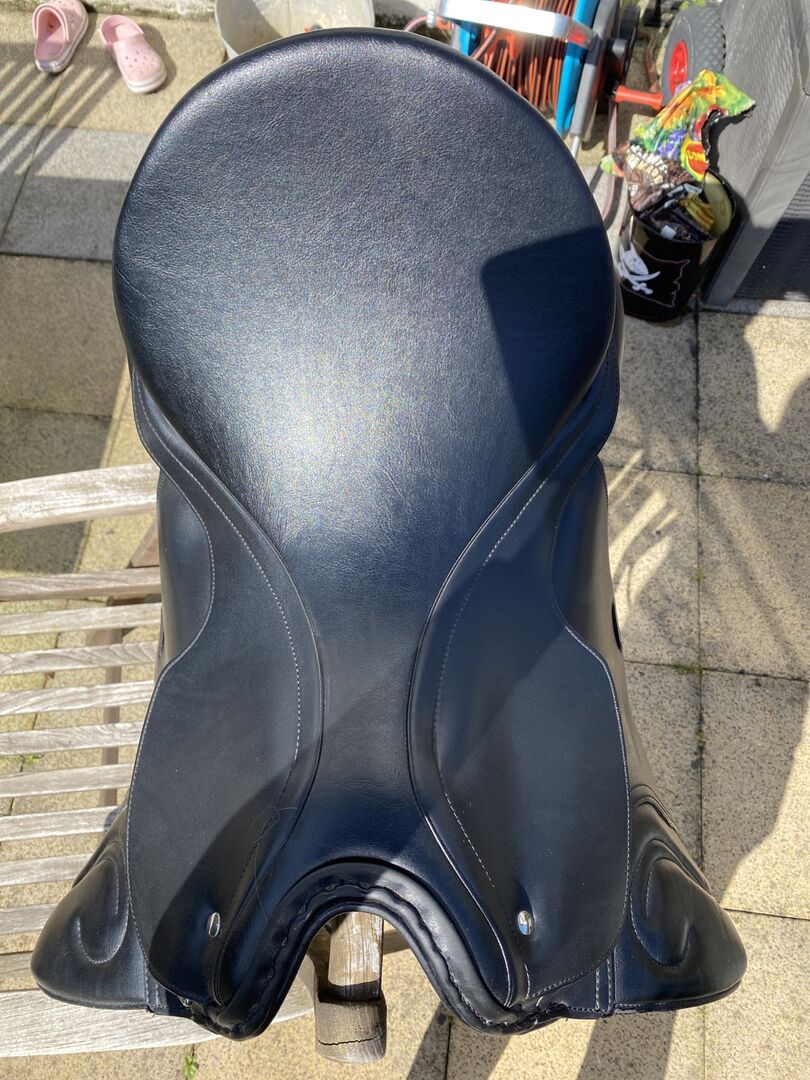 Saddle tree with gullet plate - individually adjustable through cold shaping. Deep, comfortable seat Fixed knee rolls Long straps Material: Micro-fiber Leather saddle panel filled with wool 17.5 inch 44 cm contact surface Medium chamber New price approx. 1200€ The saddle can be tried out for a deposit.