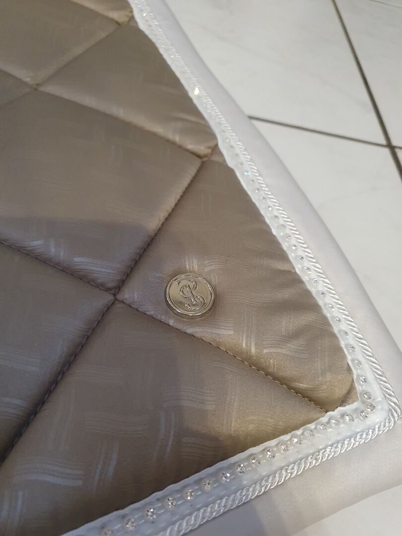 Dressage saddle pad PS OF SWEDEN natural moon skirt new - For sale I offer a new dressage saddle pad in Full. The color is called Moon Rock and is an understated, elegant darker beige. The edge is cream and in between each is a white cord and a row of very pretty glittery rhinestones. The outer fabric is subtly patterned in itself. At the front of the saddle pad is a cushion instead of stripes incorporated to prevent slippage.