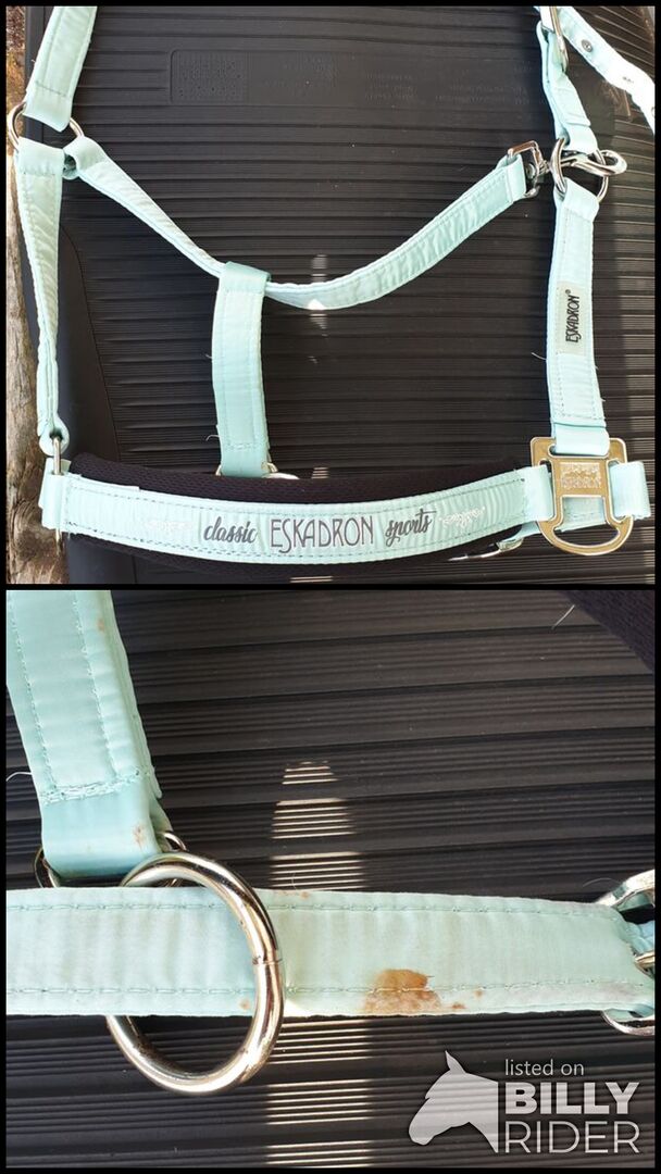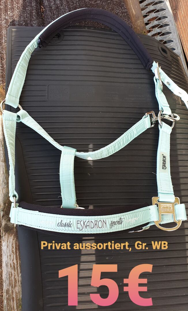 Eskadron Jade halter size WB - Halter in size WB used. Has a stain on the chin strap. I can not guarantee that you can get the stain completely out. Otherwise it is in great condition. 15,00€ Cash payment possible at pickup in 95447. Who wants Paypal must pay the fees themselves and pay on top of the purchase price.
