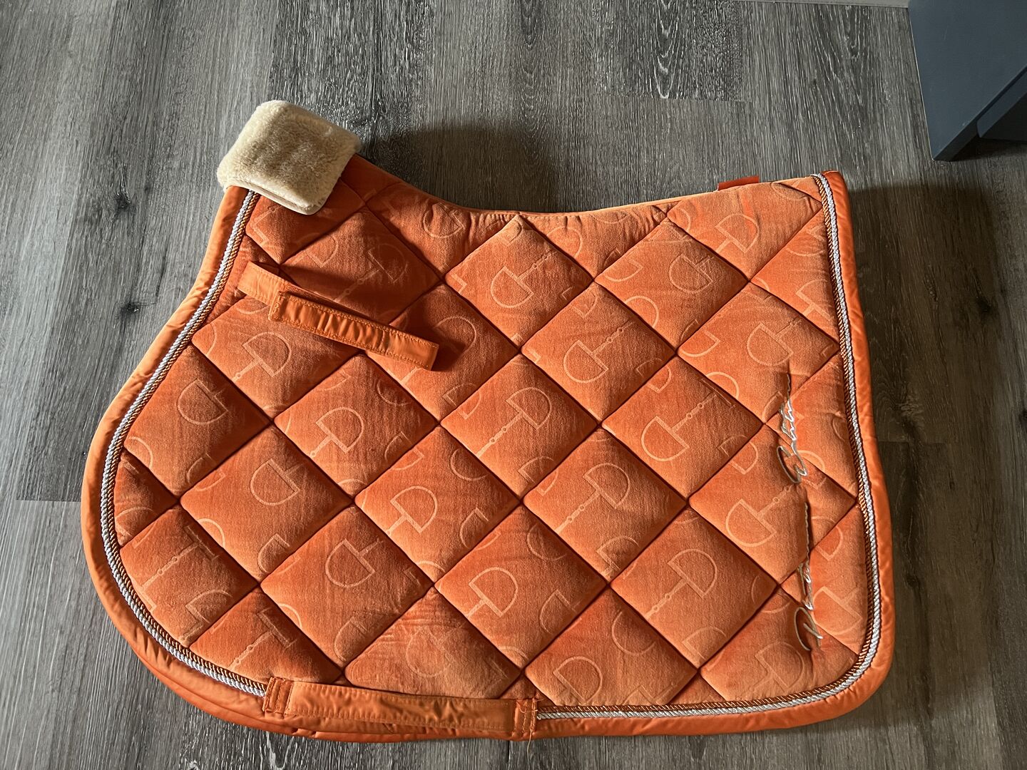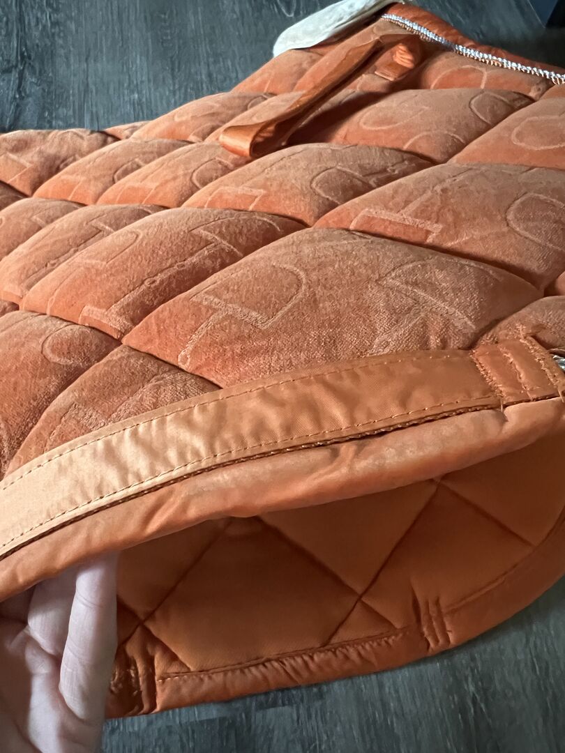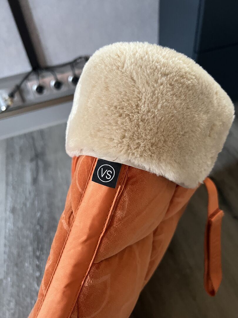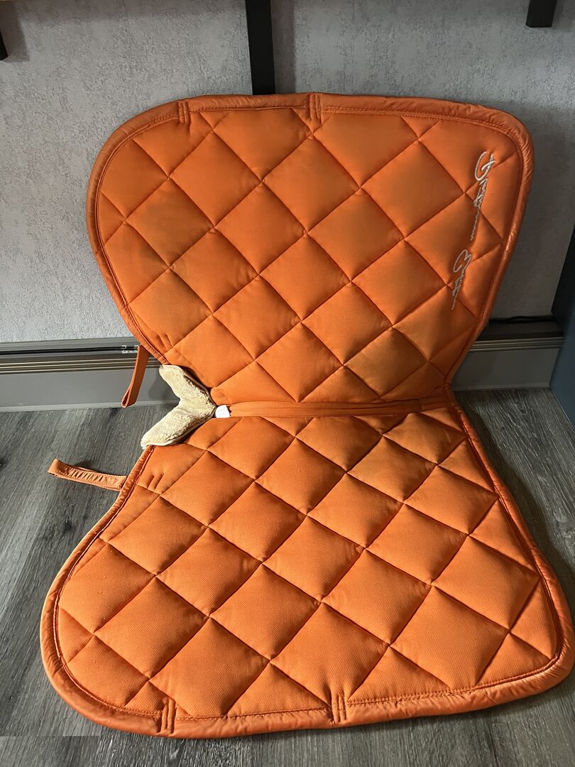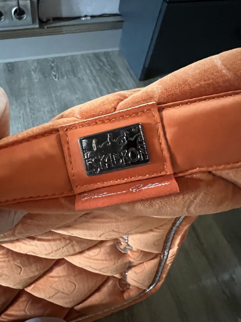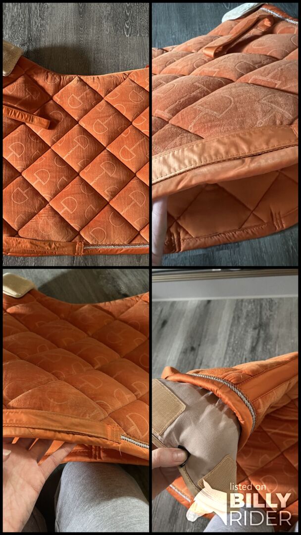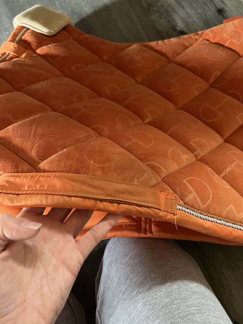 Sell a used but still in super condition saddle pad from Eskadron. It is the Velvet stamp in the color vermillion orange. It has a beautiful fur edge at the withers, which can also be removed, as this is merely fixed with Velcro. On the saddle pad itself is the fluffy part from the velcro. I have used it with pleasure, yet it is not deformed, not flattened and the velvet cover is also not worn. Only very minimal saddle stains in girth position it has, but which you can see only when looking closely. The saddle pad is super thick padded and the saddle can not slip on the velvet. Sold it only because I have not used it for a long time and I also just have too much.