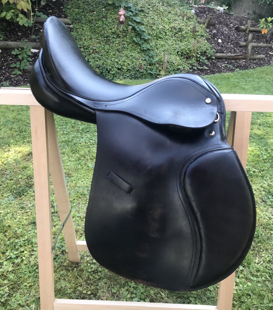 Eventing saddle 17,5" - We are selling our pony's eventing saddle. The saddle has not been used for a long time and would need to be re-padded. It has some discoloration on the saddle flap (see pictures), but this is no longer visible once you sit in the saddle.