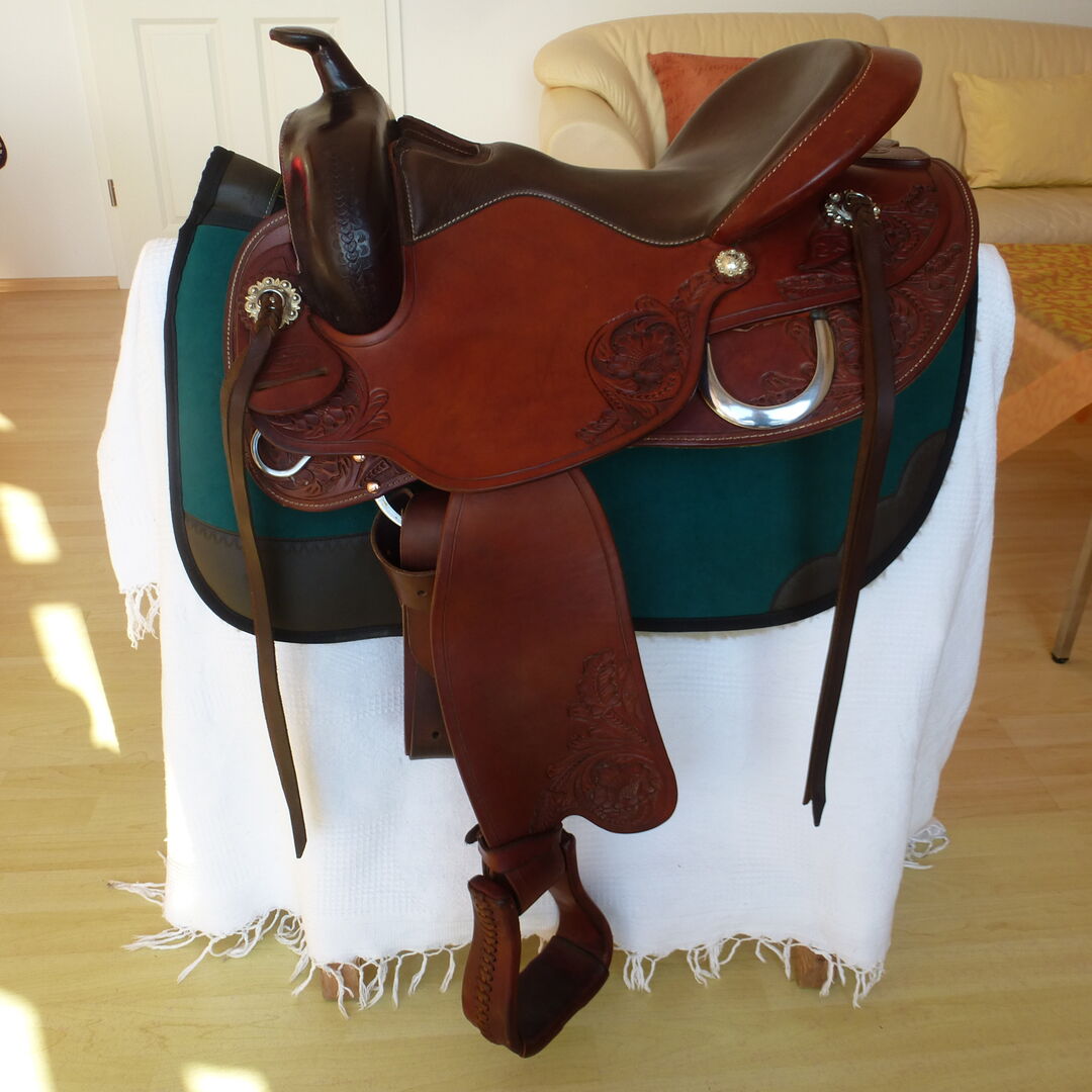 Freemax western saddle short cow - Offer a Freemax western saddle short cow with 5 er fork. It was made in 2018 from high quality cowhide (so no buffalo leather !). The saddle fits snugly to the back of the horse. Very nice floral hallmarking. The fork can be replaced and thus adapted to any horse. Adjustable fenders. You sit close to the horse. 15 seat Length 60 cm. Thus, it fits perfectly even on short horse backs. I am absolutely thrilled with this treeless saddle. No spongy feeling and my horse is even more thrilled ! I give the saddle only because the seat is too small for me. The western pad is already sold and does not belong to the offer. Questions I answer gladly and promptly !
