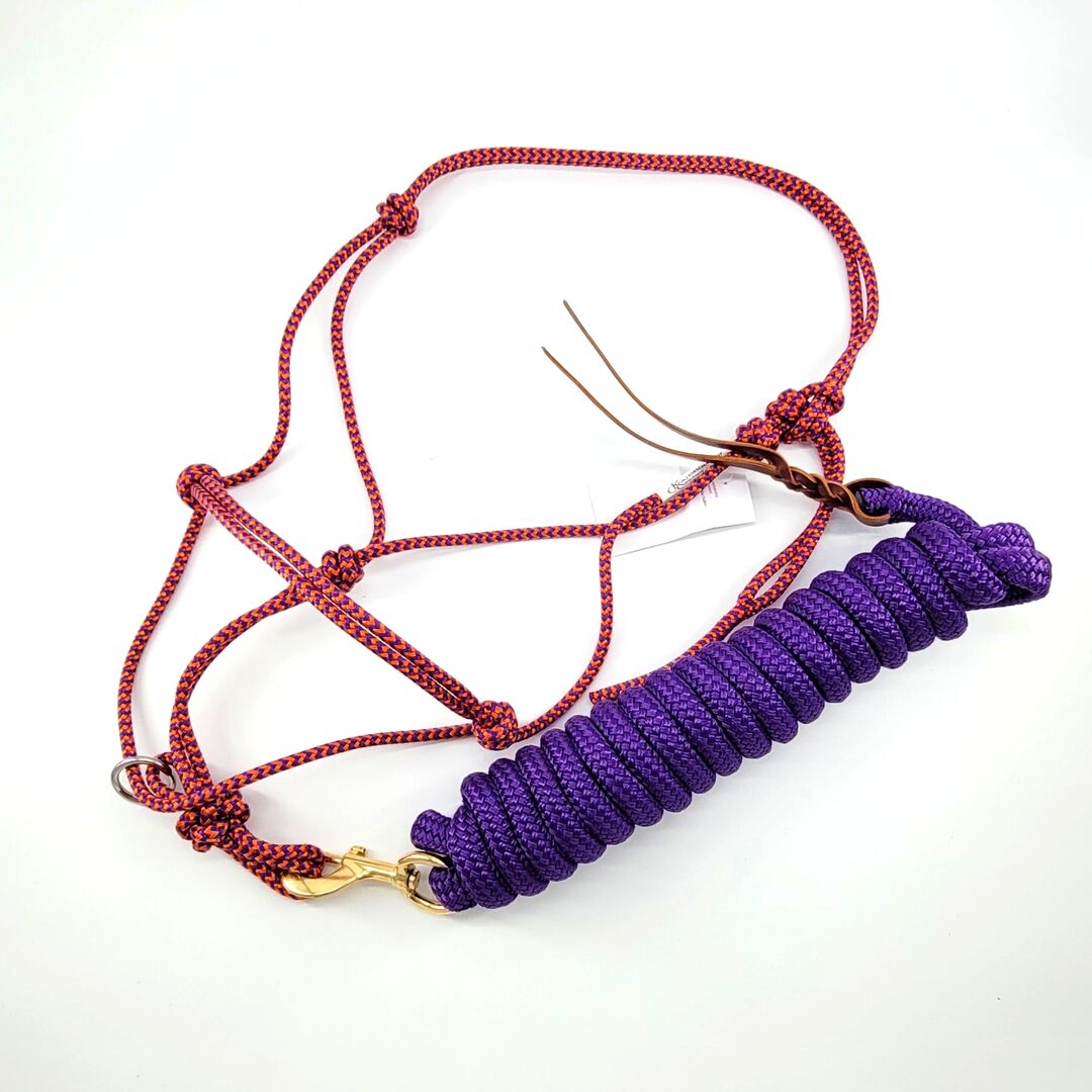 GKH Professional Rope Helix Sliding Ring Knot Halter VALERIA with Groundwork Rope - Valeria knot halter with ground work rope Thinner Professional Rope knot halter with sliding ring and ground work rope in dark orange and purple.