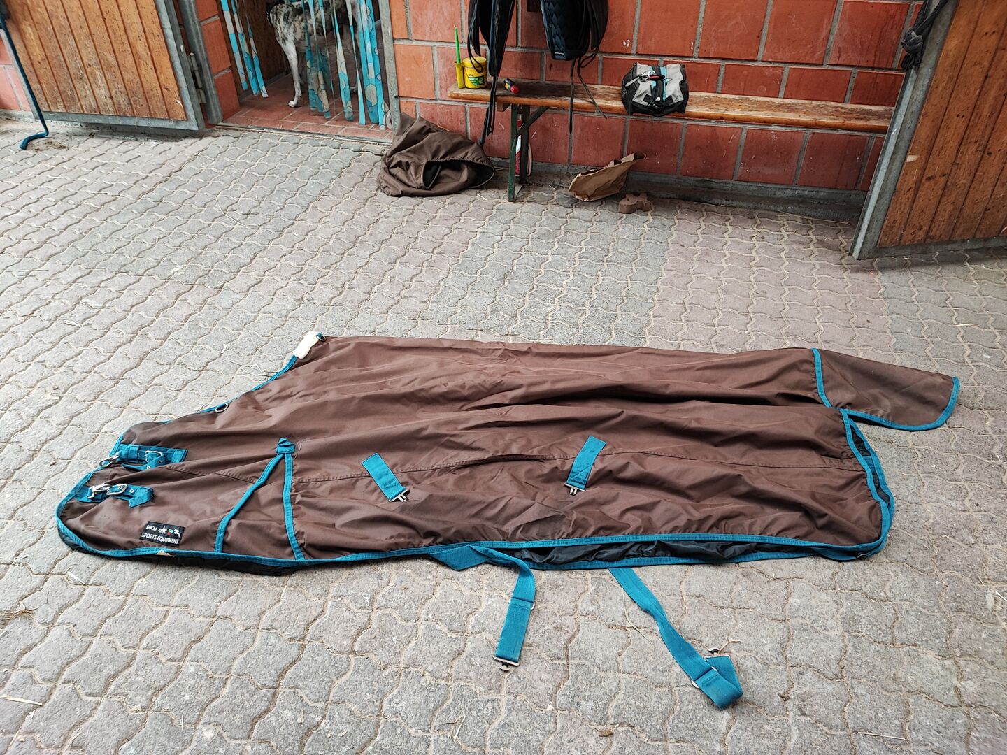 HKM outdoor blanket winter 155cm 200g - Used HKM outdoor blanket 155cm with 200g Freshly washed and impregnated Small defects see pictures Has only 1 leg strap