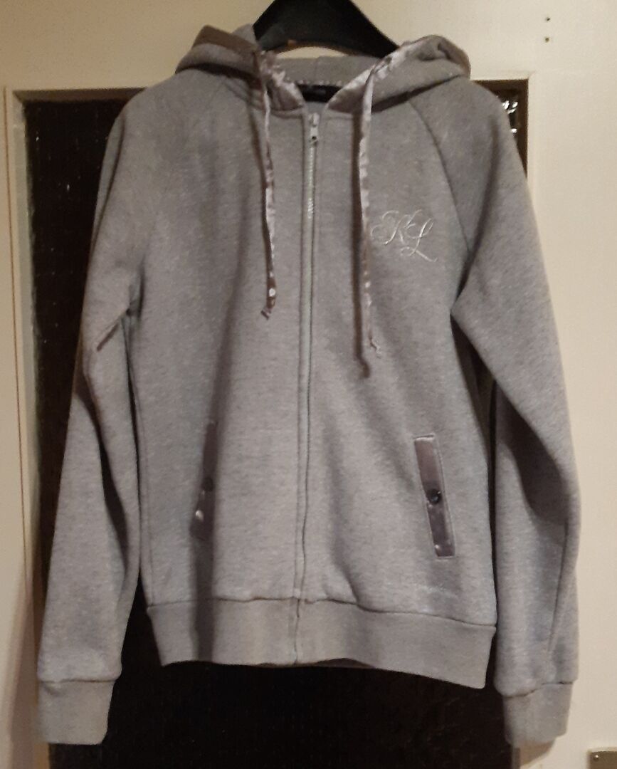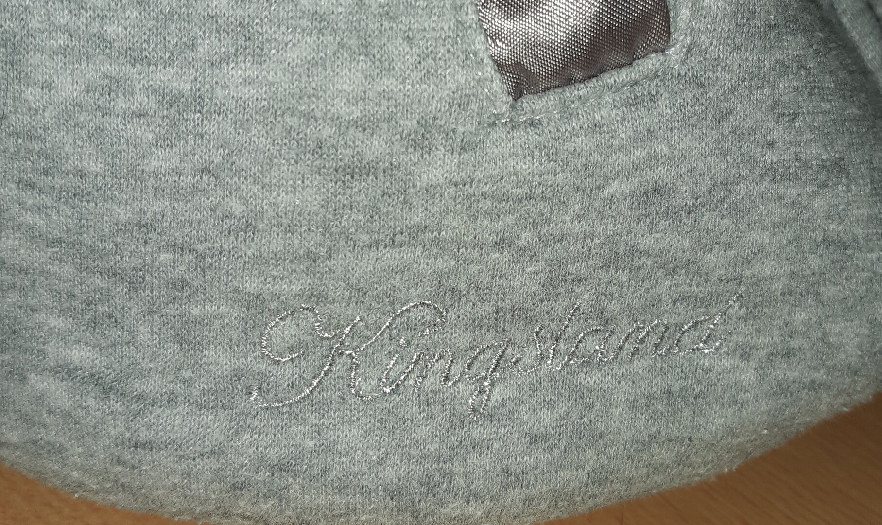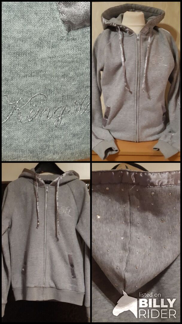 Sell my beautiful sweater jacket from Kingsland from the Dressage collection in grey. On the left chest there is the abbreviation with silver thread. Under the left pocket there is the Kingsland writing also in silver. The hood and pocket hem is bordered with satin ribbon and the ribbons are also made of satin. The pockets are closed with a snap fastener. On the sleeves there is also a satin ribbon sewn in the middle. The hood is in different sizes stones glued on.