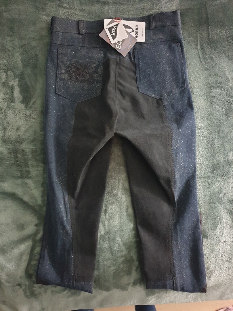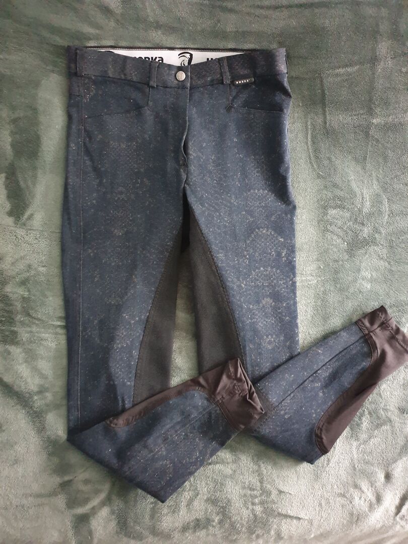 Breeches by Horka in dark blue with glitter, imitation leather full seat and elastic leg cuffs.