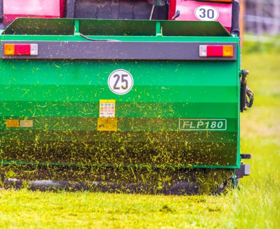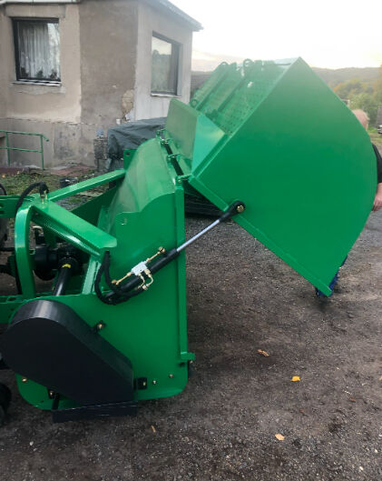 Pasture maintenance with flail mower with collecting tray - Flail mulcher GEO FLP 180 with collecting tray Collecting tray 2000 l, hydraulic opening, hammer flail 1200 gramm, for tractors from 50 hp Ideal for mulching meadows, collecting leaves and horse droppings.