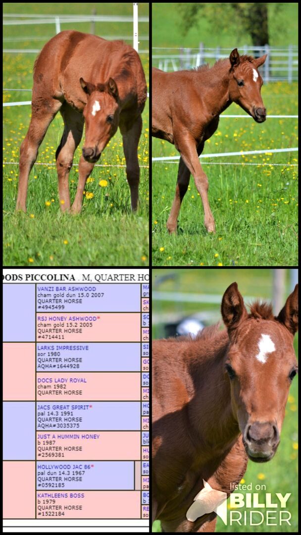 Quarter Horse dark chestnut filly looking for her heart man - Typey filly in dark chestnut, *Piccola* (born 03/2023) convinces with correct conformation and good movement qualities, as well as with a friendly, people-oriented character. She presents herself perfectly from the first day on and is a real eye-catcher. Due to her pedigree (Hollywood Jac 86 on paper!!) one can imagine *Piccola* in Reining and also well in Ranch Horse disciplines as well as Trail and/or just simply as a reliable riding partner in the spare time.
