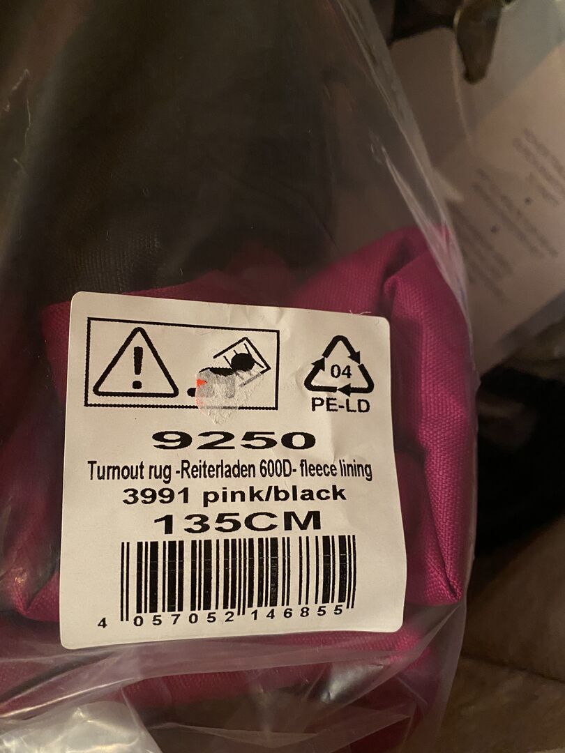 Rain rug 600D in pink / black - Offer a brand new rain blanket in pink / black 600D (was only for trial on it). Blanket is 135 cm. (Fits my final size pony unfortunately not). Blanket has belly straps and a tail strap.