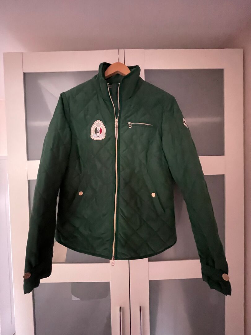 RIDING JACKET IRIS BAYER model Sharon - RIDING JACKET IRIS BAYER GREEN QUILTED JACKET SHARON LADIES SIZE 40 - Well-fitting, longer fit with waist adjustment - Waist adjustment with adjustable back straps - A great jacket for all year round thanks to the light padding - Decorative IRIS BAYER Italo badges on the front and sleeves - High-quality 2-way zipper in ice gold - Breathable and wind-repellent - High-quality 2-way zipper in ice gold - Decorative Italo badges - Contrast lining in Italo green - Lightweight - Slight sheen effect