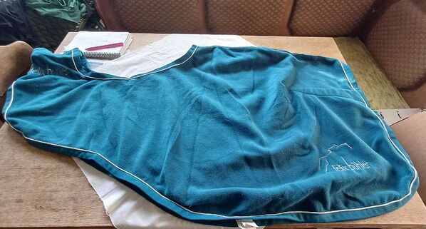 Riding rug / sweat rug fleece - For sale riding rug made of fleece by Felix Bühler, color petrol, saddle cut-out, double Velcro fastener, size 125