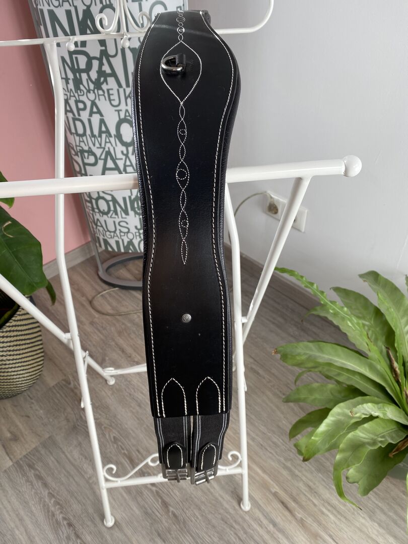 Saddle Girth Fouganza Leather black 115cm - I sell here my black Fouganza girth, because it does not fit my horse. It is new (only once been on when trying on) and 115cm long. The girth has an anatomical recess and thus offers more freedom of movement for the horse. The girth is very easy to put on, as it has elastic straps (double thickness) and roller buckles on both sides. It is very comfortable because the inside is made of leather and has soft memory foam. In addition, the buffalo leather makes it very easy to care for and also resistant. The ring on the girth is very suitable for attaching loop reins and auxiliary reins. The girth also looks very nice.