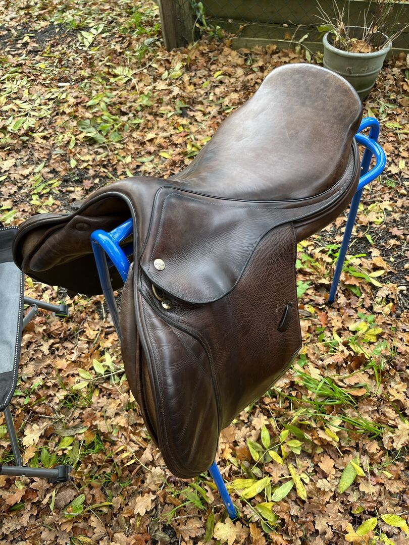 Chocolate all calfskin M/M double flap, very comfortable. Bought second hand, but good condition. Unfortunately unable to use as seat too long for my pony.