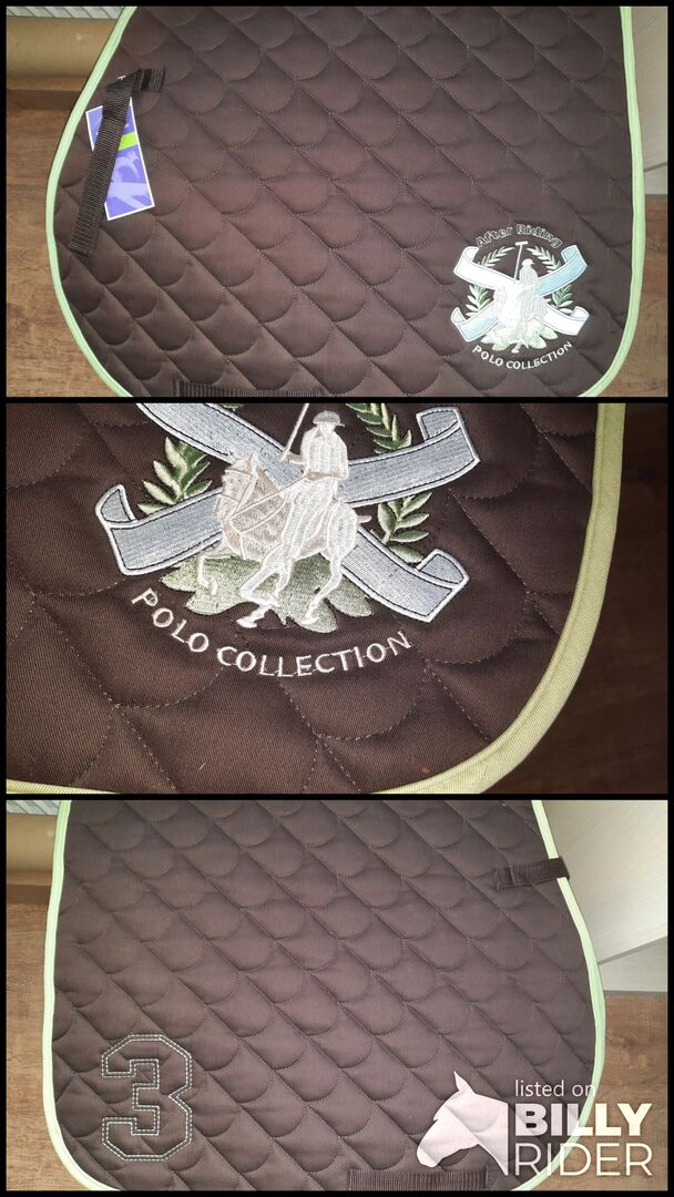 Saddle pad - Polo player relief embroidery in contrasting colours on the ascending side (left) and the number 3 in double basting stitches on the opposite side. Border in contrasting colours, Velcro tabs. 100 % cotton with 400 g/m² polyfill filling with quilting in a cloud motif Brown/ contrast green