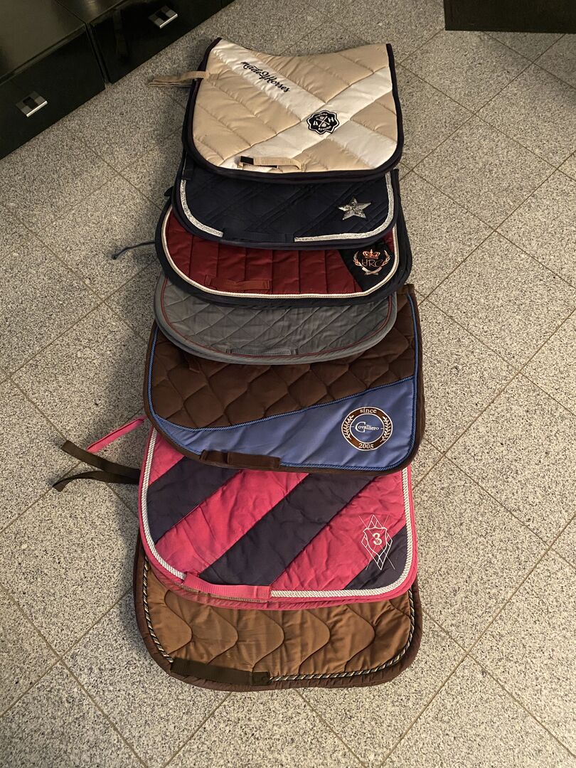 Saddle pads Full - Offer here several saddle pads from 10 euros. The saddle pads are all in size Full. They are all dressage saddle pads (saddle pad in Bordeaux could also be VS). All saddle pads and climbers are in a very good condition! The saddle pads Have no holes or stains, some have a few fur remains😉. If you have any questions please contact me. Prices are VB Single pictures Picture 1= Beige / wool white DR 15 Euro Picture 2= Blue with silver sequins 20 Euro Picture 3= Bordeaux/dark blue with cord beige and white DR or VS Full 12 Euro Picture 4= grey with border in bordeaux 10 Euro Picture 5= brown with blue Covalliero 15 Euro Picture 6= Pink/blue with white silvery cords 10 Euro Picture 7= Eskadron in brown with cord edge 18 Euro