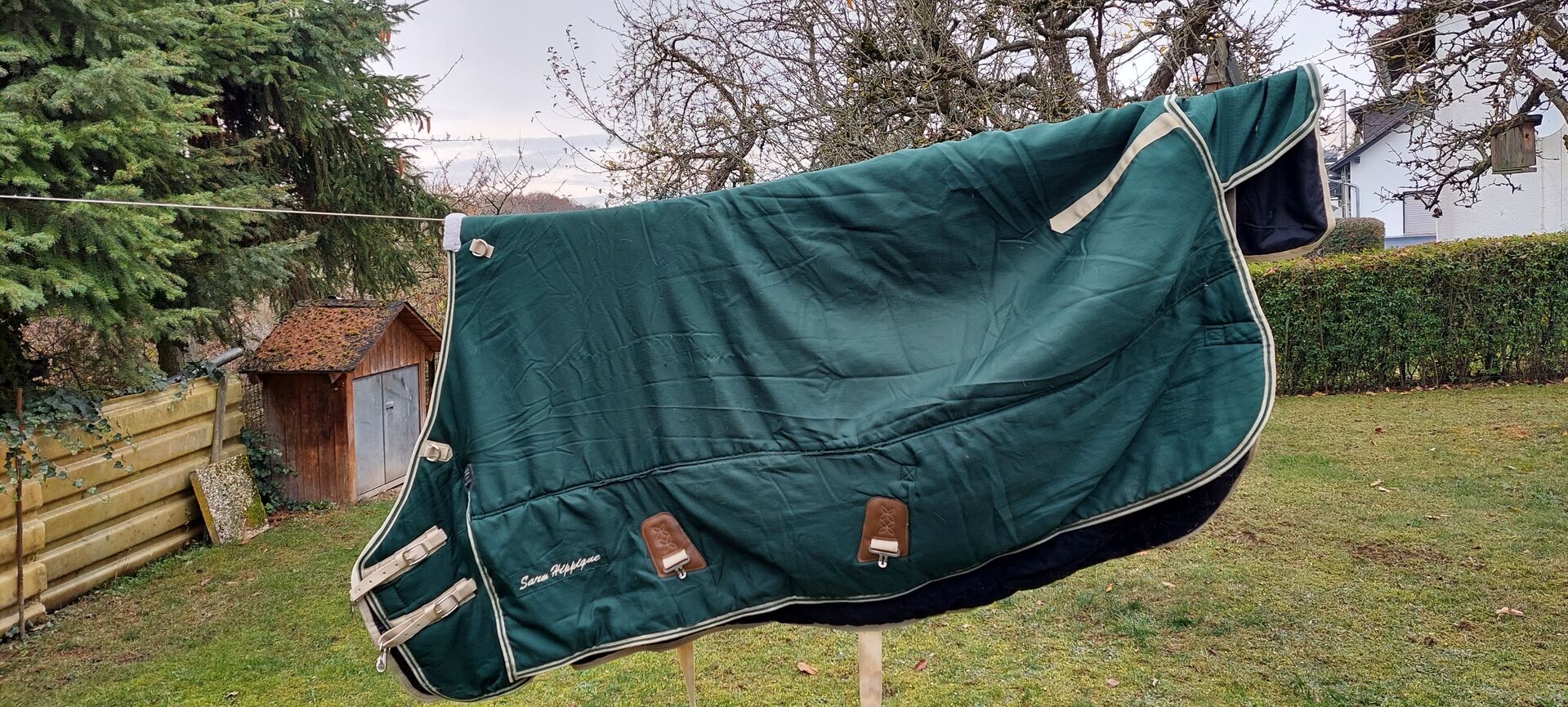 Stable blanket from Sarm Hippique 155 - I sell here a used stable blanket from Sarm Hippique. The blanket has a 300 g filling. It has signs of use ,but is not defective. Color green with leather patches. Fixed price 15 euros