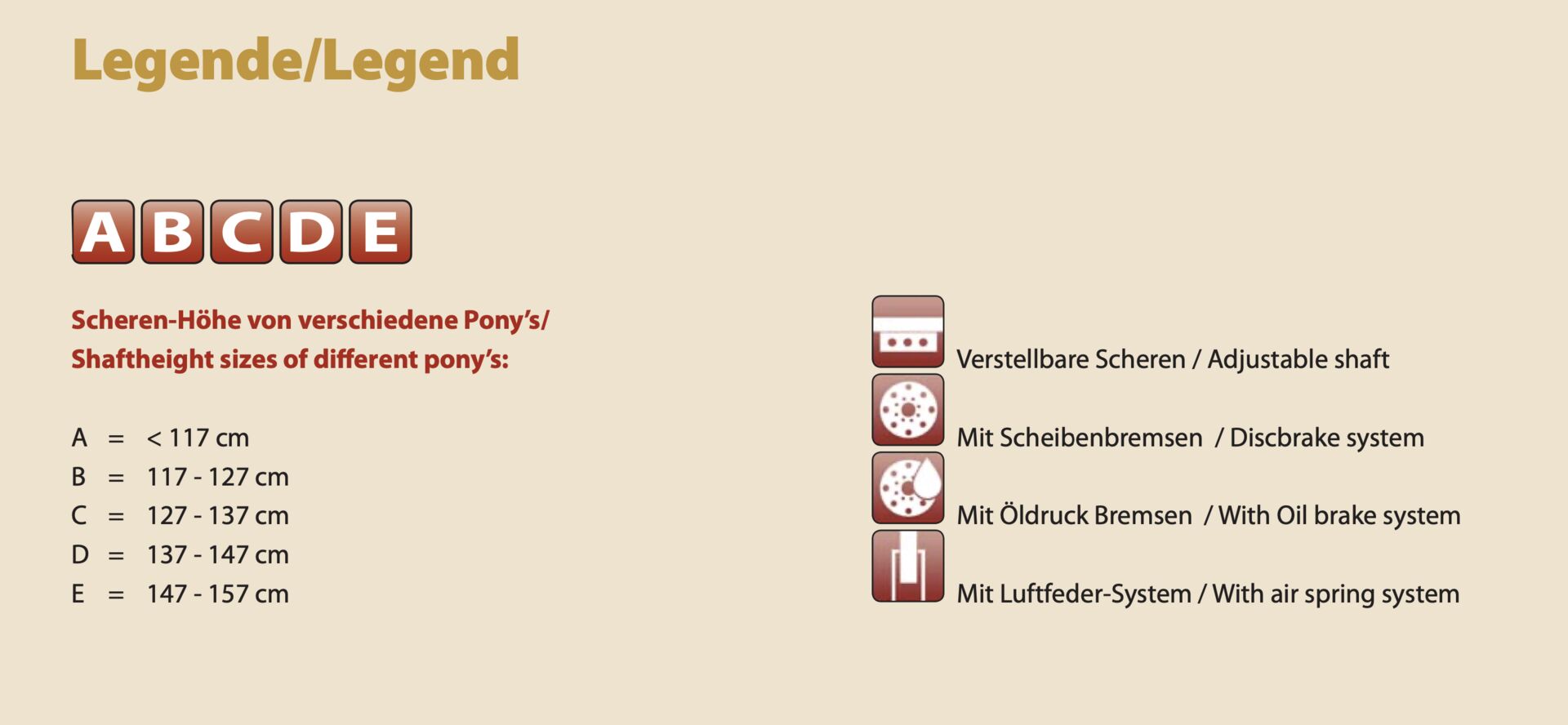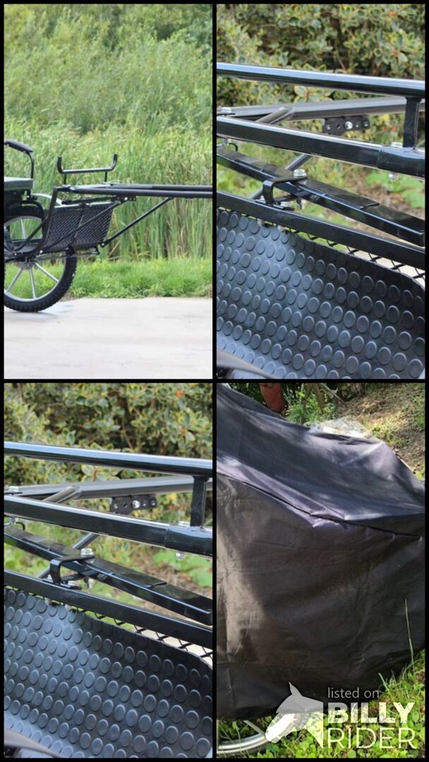 To be given away because of harness driving The Pony Sulky "Oxer" is suitable for larger ponies from about 110cm to 150cm.The scissors can be adjusted to the size of your pony in five steps in height and infinitely variable in width at the front.This sulky has a leaf suspension of the axle and additional shock absorbers under the seat for best possible driving comfort.Mudguards, mud mat and whip holder are also part of the standadra equipment for this model, just like the buck cushion for the driver. There are also two new tires. For this Sulky is further, rich accessories available with it is a suitable cover hood