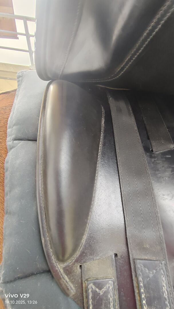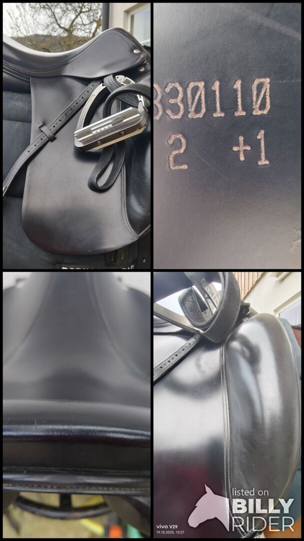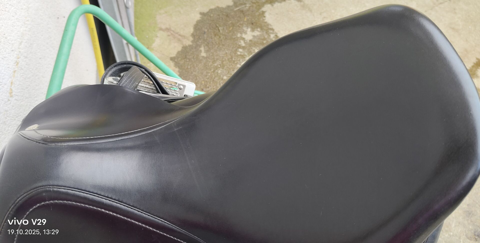 THIS IS HOW THE SADDLE WAS ADVERTISED: The Amerigo Basso is suitable for short, slightly rising horse backs with rather low withers. The semi-deep seat offers the rider plenty of freedom and places him close to the horse. Model: Basso Seat: 17 inch Saddle flap: normal Year of manufacture: 2010 Chamber width: +1 Cushion filling: wool Color: black Fit: for short horses with a slightly rising backline and rather low withers Condition: in very good condition, slight signs of wear Leather: cowhide Cushions: French suspended banana cushions knee rolls: large Seat: semi-deep Girth: long girth straps Original price: 4375€ Retail price: 999€