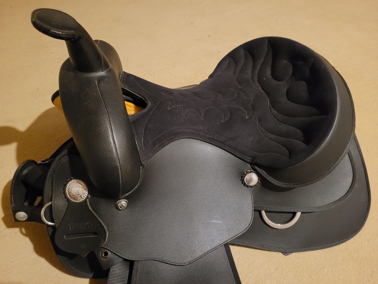 Western saddle black 38cm =15" - I am offering a very chic western saddle in black (silver buckles) in top condition. Has been ridden approx. 15 times, has been stored warm and dry in the cellar since then.
