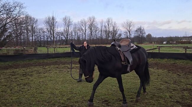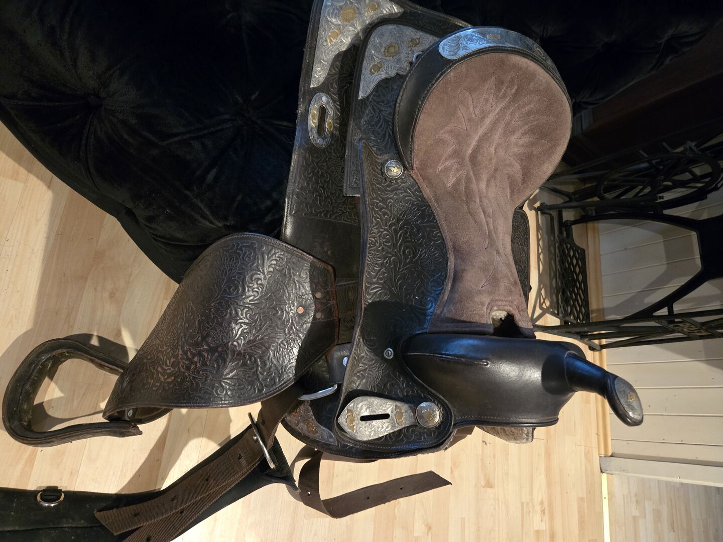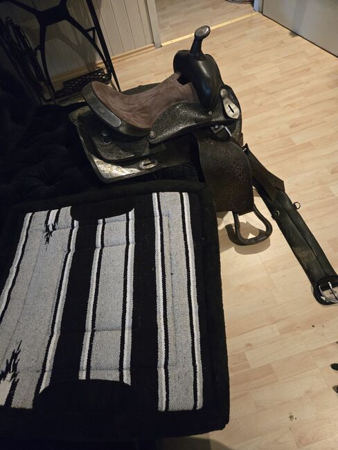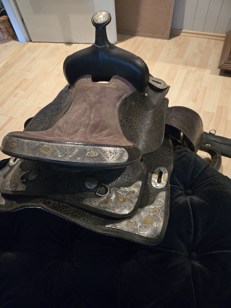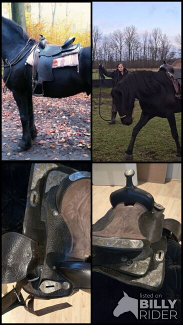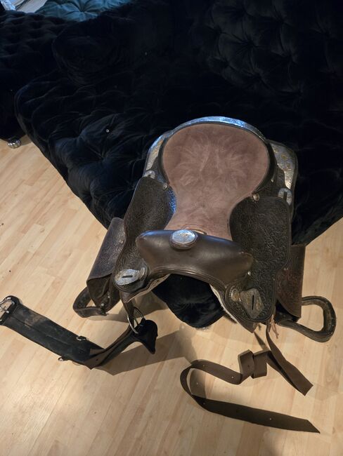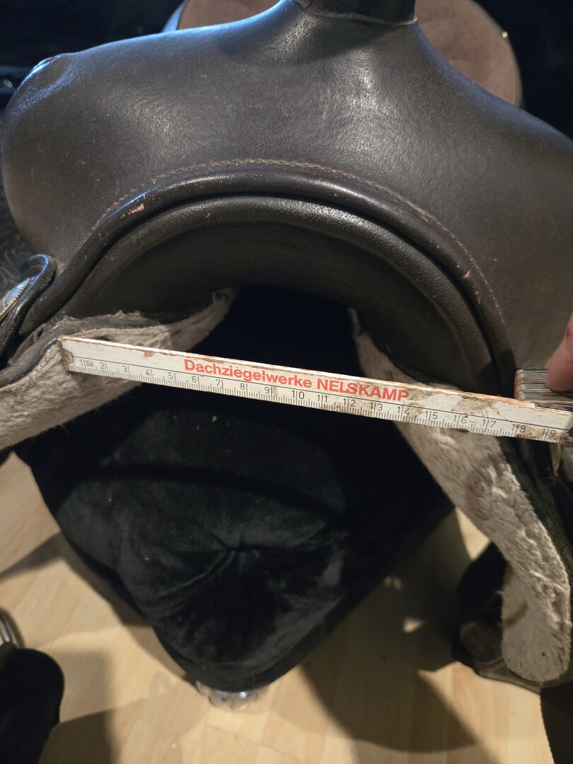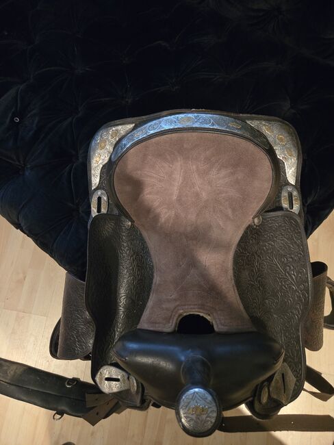 So if you are looking for a western saddle in dark brown with lots of metal fittings and a wide chamber (approx. 17 cm see picture) at a reasonable price.