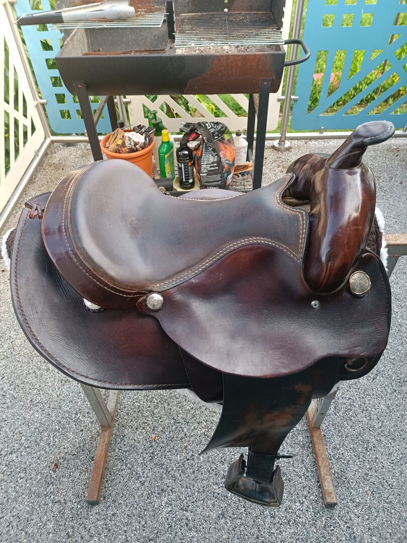 Western Saddle Ralide Pad - Old but very comfortable saddle, Fits my Tinker unfortunately not . I bought it myself used, should be a brand saddle from USA. In the tree is a very poorly readable print: Ralide Pad 71202/. 780494 it could be. The fenders are short (38-48cm) and there are children's stirrups. I have renewed the tie strap holder, which was missing when I bought it, as well as the concha to it. Would exchange for an equivalent very short (Max 60cm edition and xfull saddle. Also a Spanish saddle would be ok Dimensions in the pictures. Pickup gladly, shipping against assumption of costs. Payment PayPal, bank transfer or cash at pickup. Also cash on delivery if the costs are taken over. Pickup on trial against purchase price deposit gladly, In case of shipping no return!